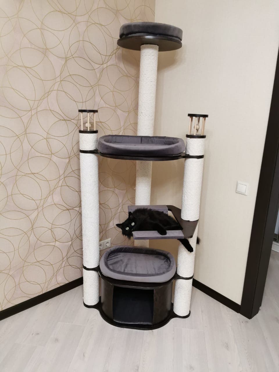 * Вертикаль: Обязательны высокие, устойчивые когтеточки-комплексы с полками и домиками наверху. Куны обожают быть на высоте и контролировать территорию. При выборе комплекса главное чтобы он был устойчивым и безопасным. На сайтахэтих производителей Вы можете найти комплекс, который подойдет и отлично вольется в Ваш интерьер: комплексы из натурального дуба CATSBY, ковролиновые комплексы ПУШОК, современные и практичные MY SNOOPY. Потребность точить коготки у мейн кунов врожденная и лучше организовать для них определенное место, иначе могут пострадать мебель, стены и т.д.
